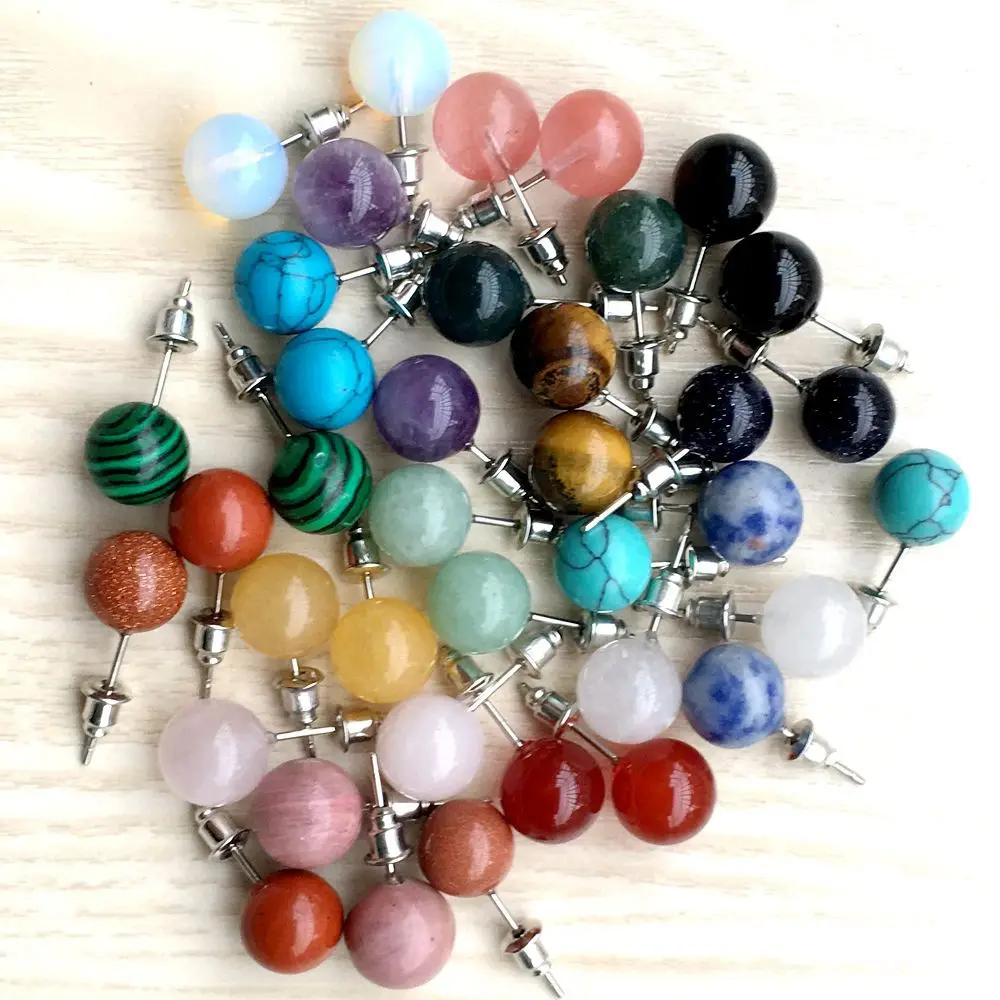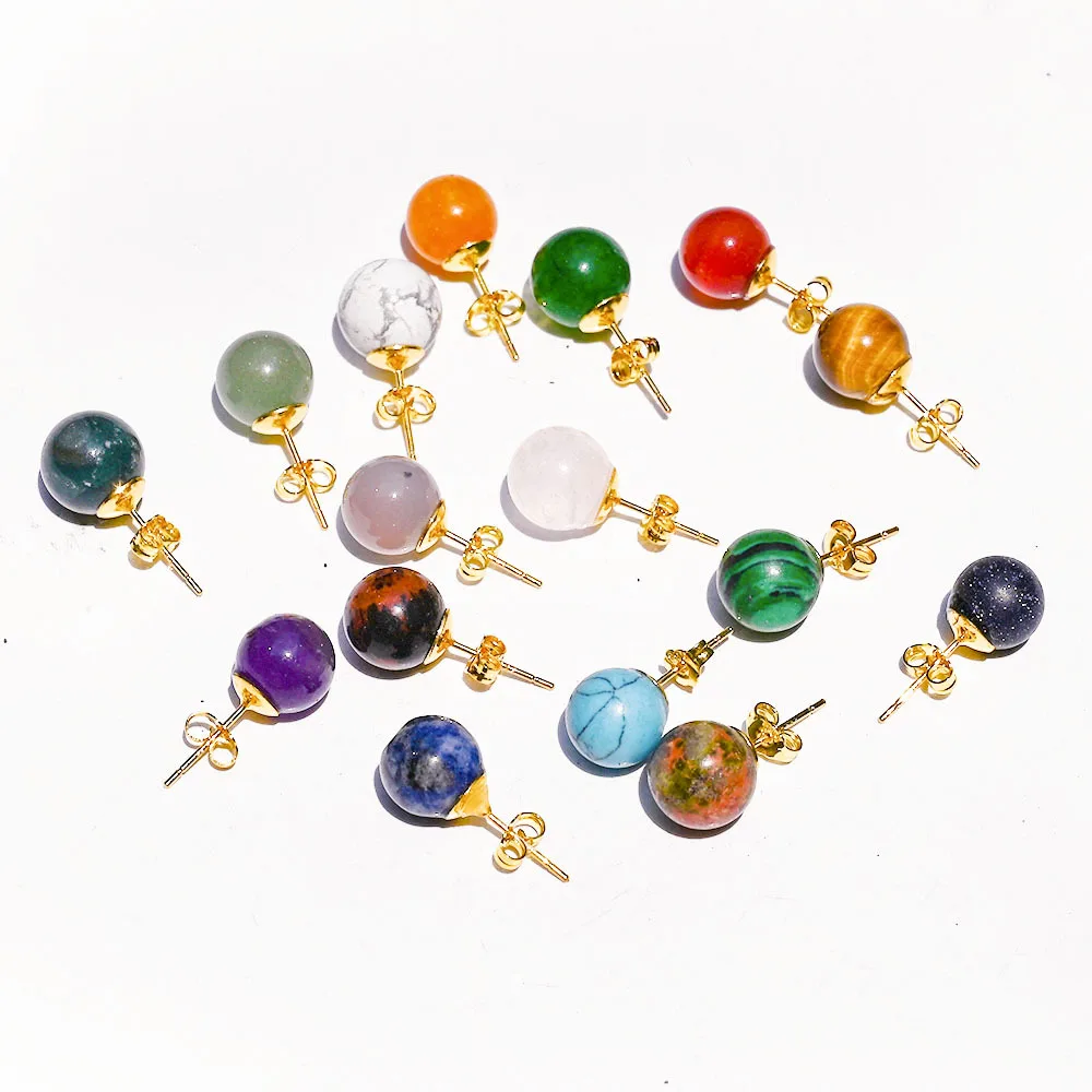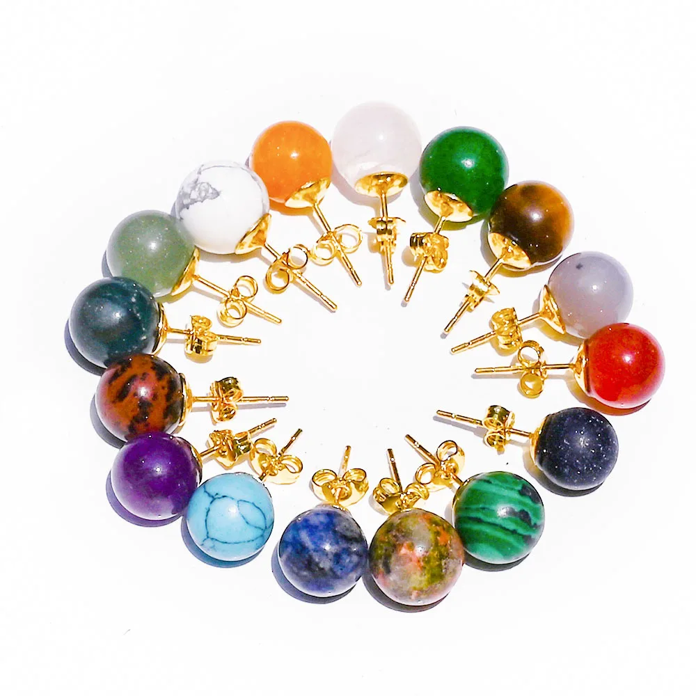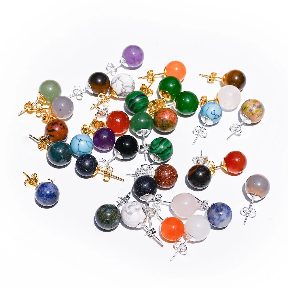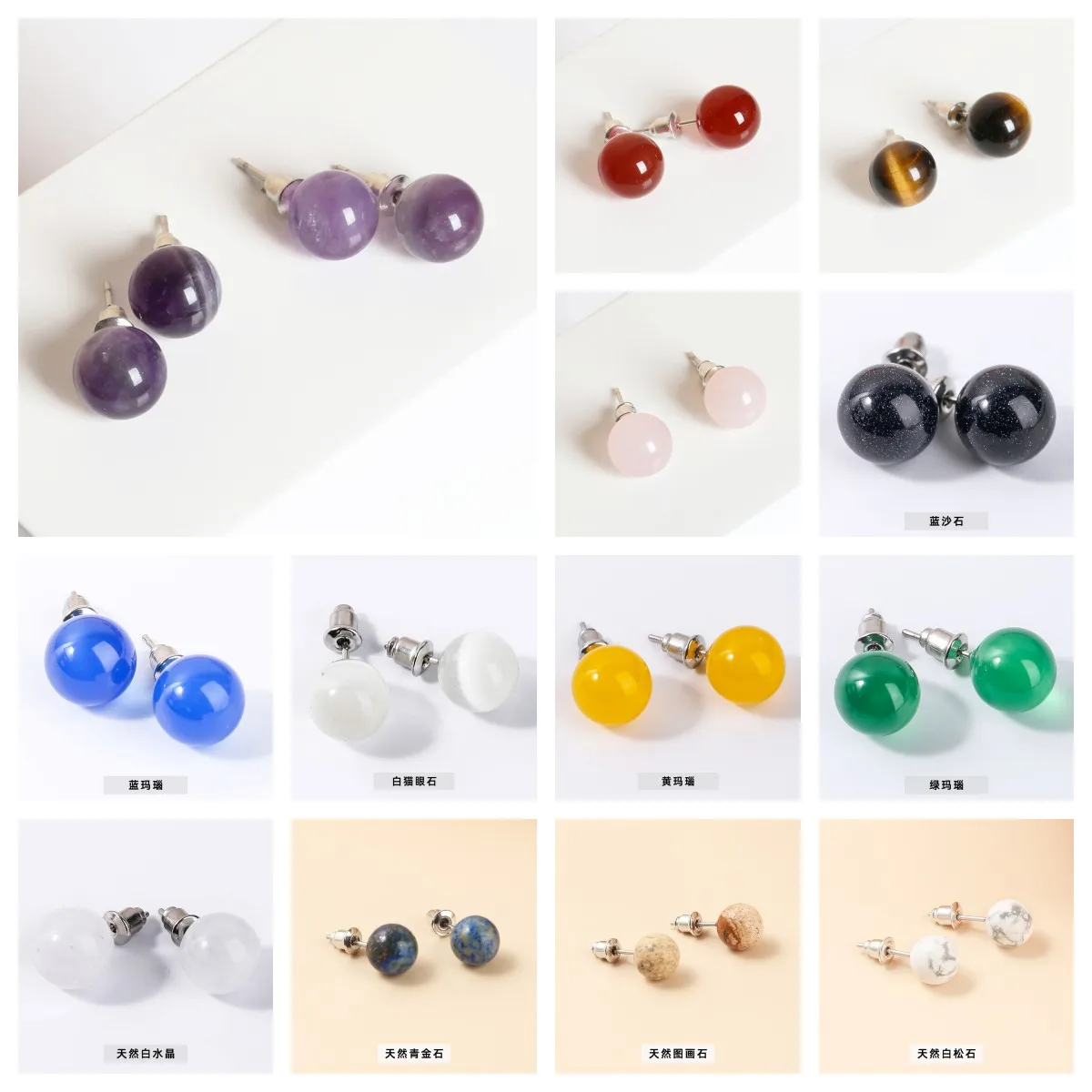 10 pairs Natural Stone Earrings Healing Crystal Quartzs Round Ball Beads Steel Stud Fashion Ear Jewelry for Women Girl Wholesale