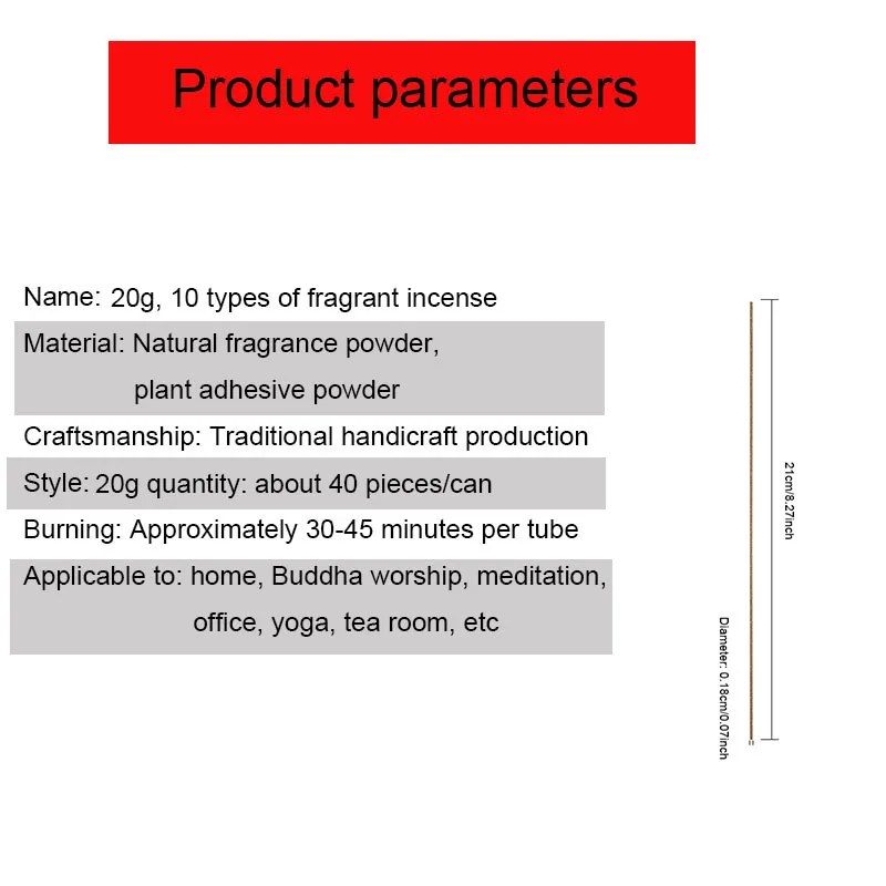 11 fragrances available in 20g cans, approximately 40pcs/can, for home lying incense and long-lasting fragrance retention
