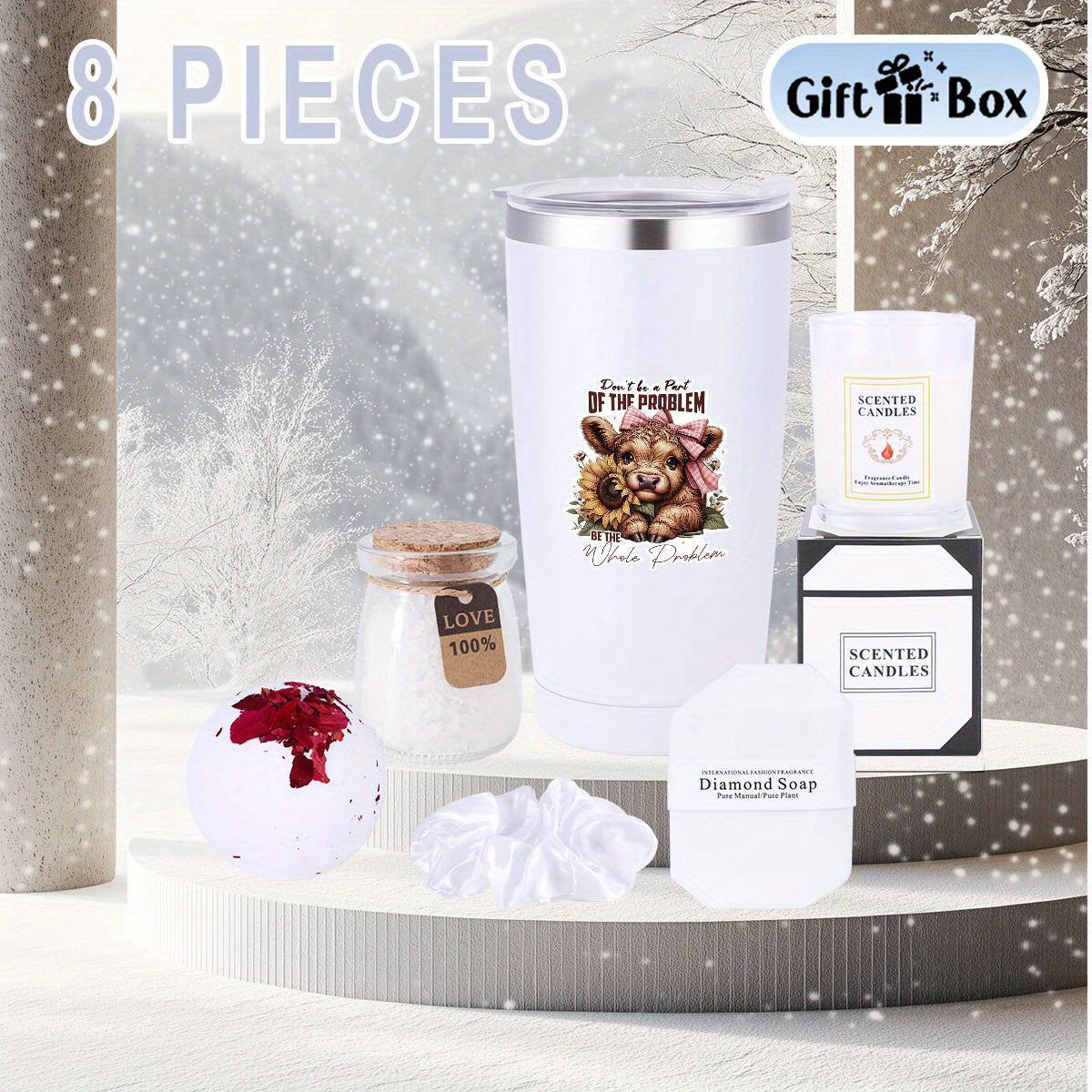 8pcs Highland Cow Women'S Spa Gift Basket, Basket Set Stuff Womens Gifts-Multi-Item Party Favor Packs Including Cup, Bath Bombs, Candles, Soap, Gift Box, Bath Salts And Thank You Cards, Gift For Women, Mom, Wife, Girlfriend,