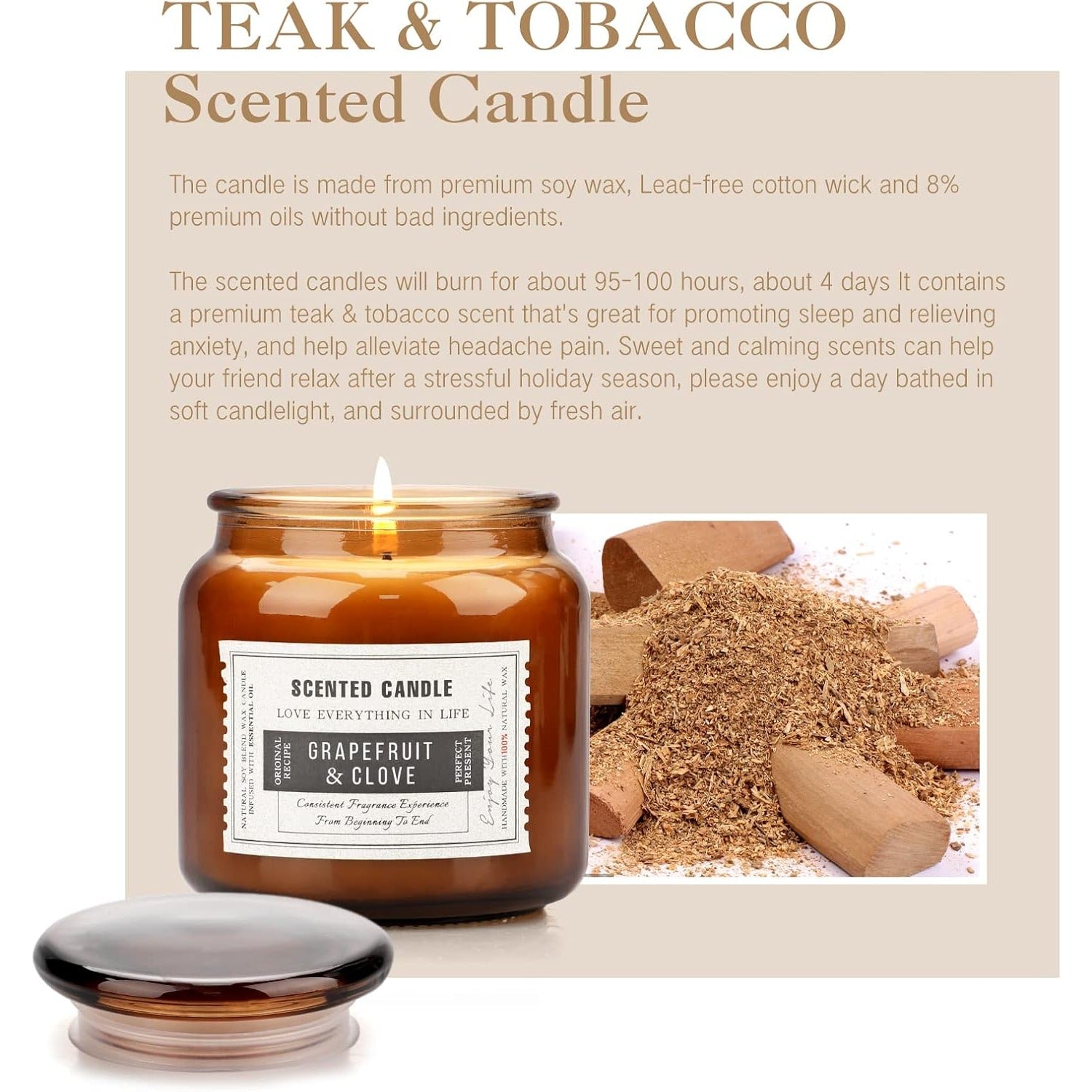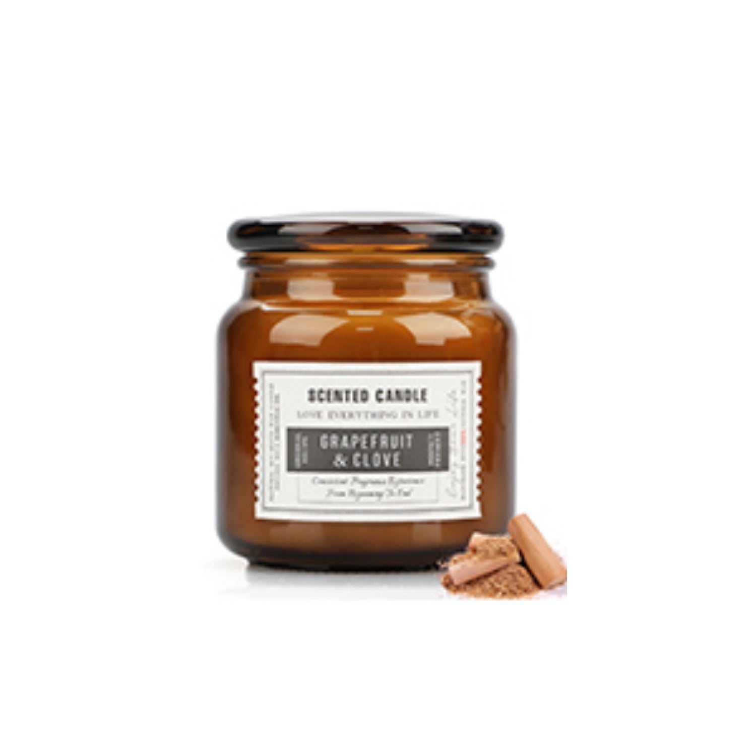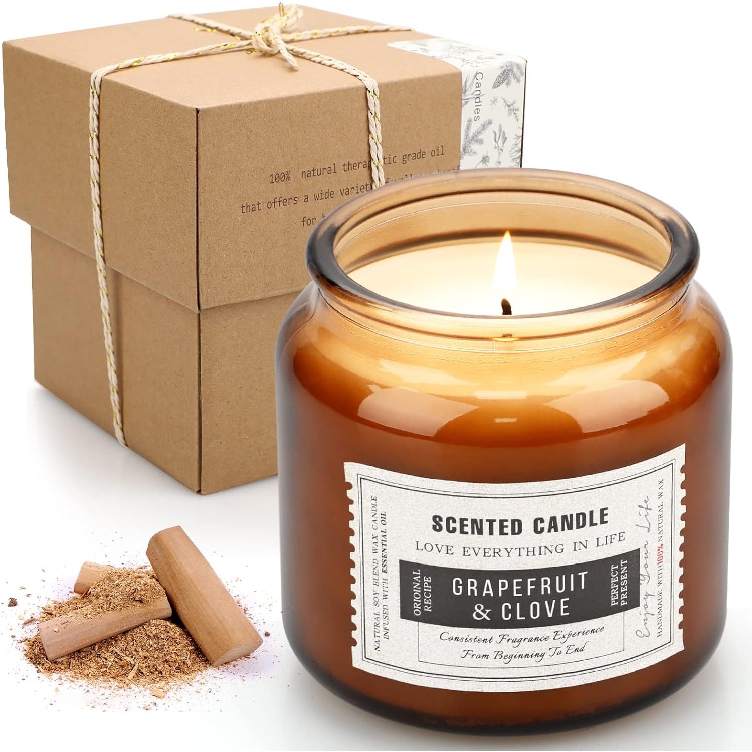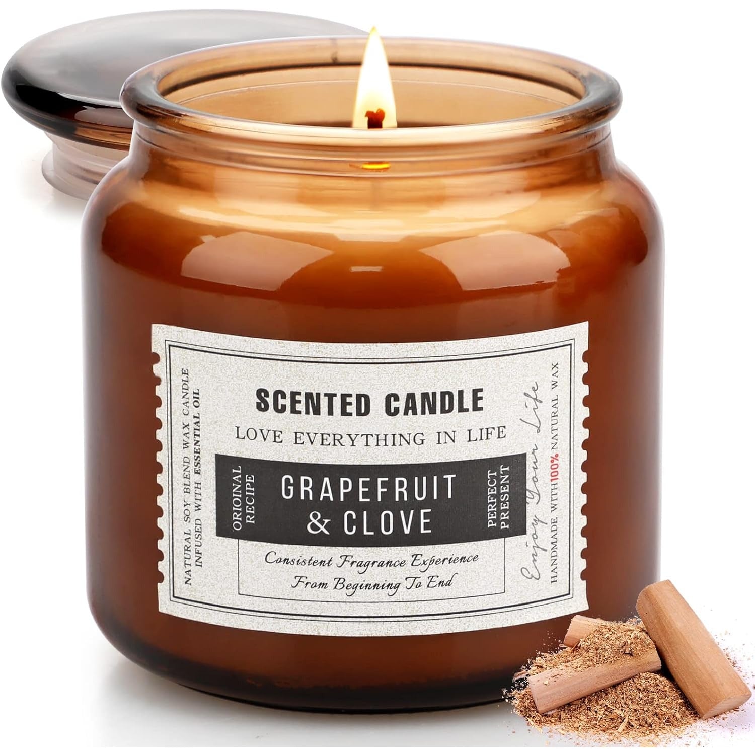 · [Grapefruit &Clove Scented Candle]: packed in a vintage gift box. Top Notes: Grapefruit, Clove, Cinnamon, Lemon; Middle notes: Pineapple, Almond; Base notes: Vanilla, Oakmoss, Cedar. Lid noise reduction design optimized the defects of traditional glass lids. Amber jars coordinate with furniture well also as decorative candles. Looks and smells decent.
