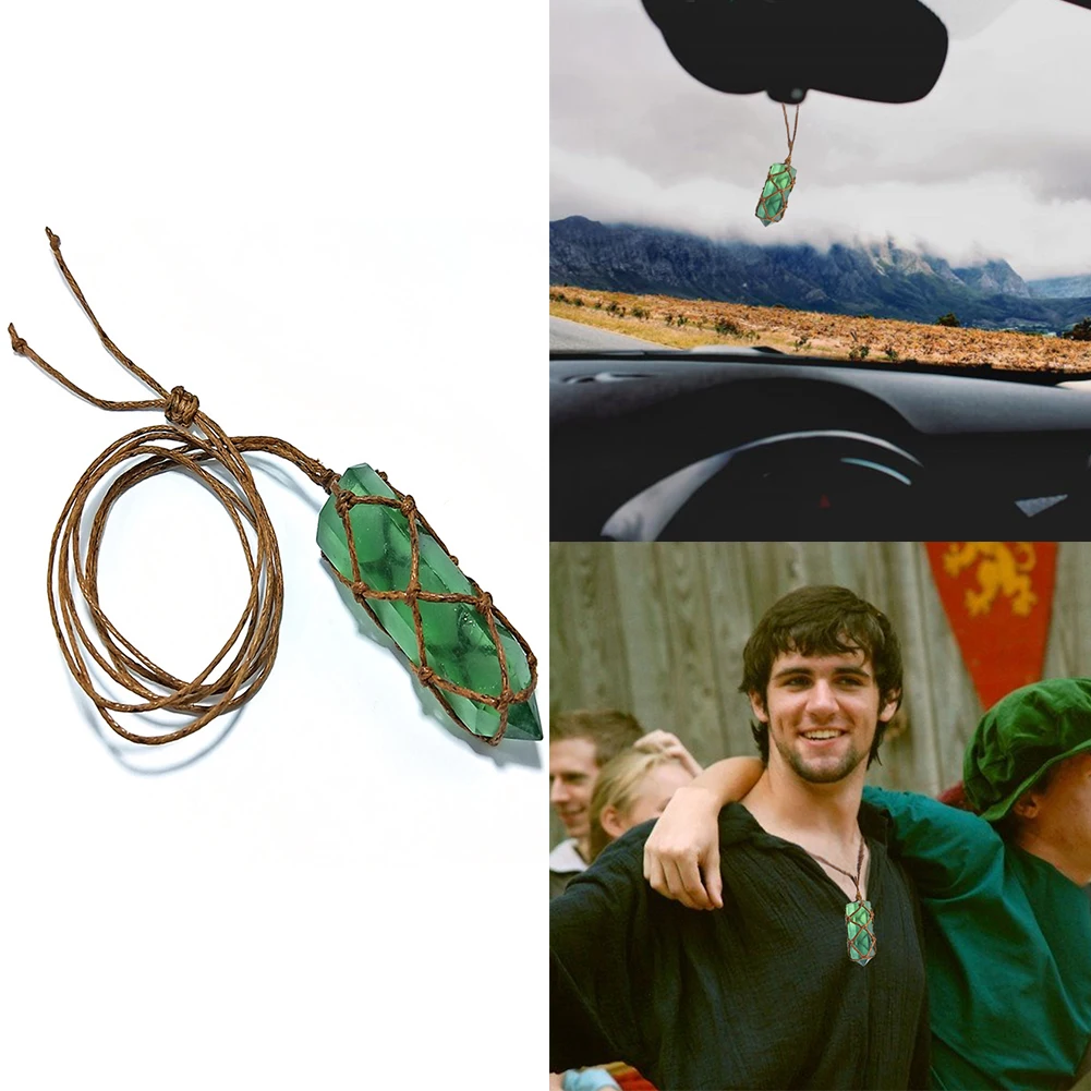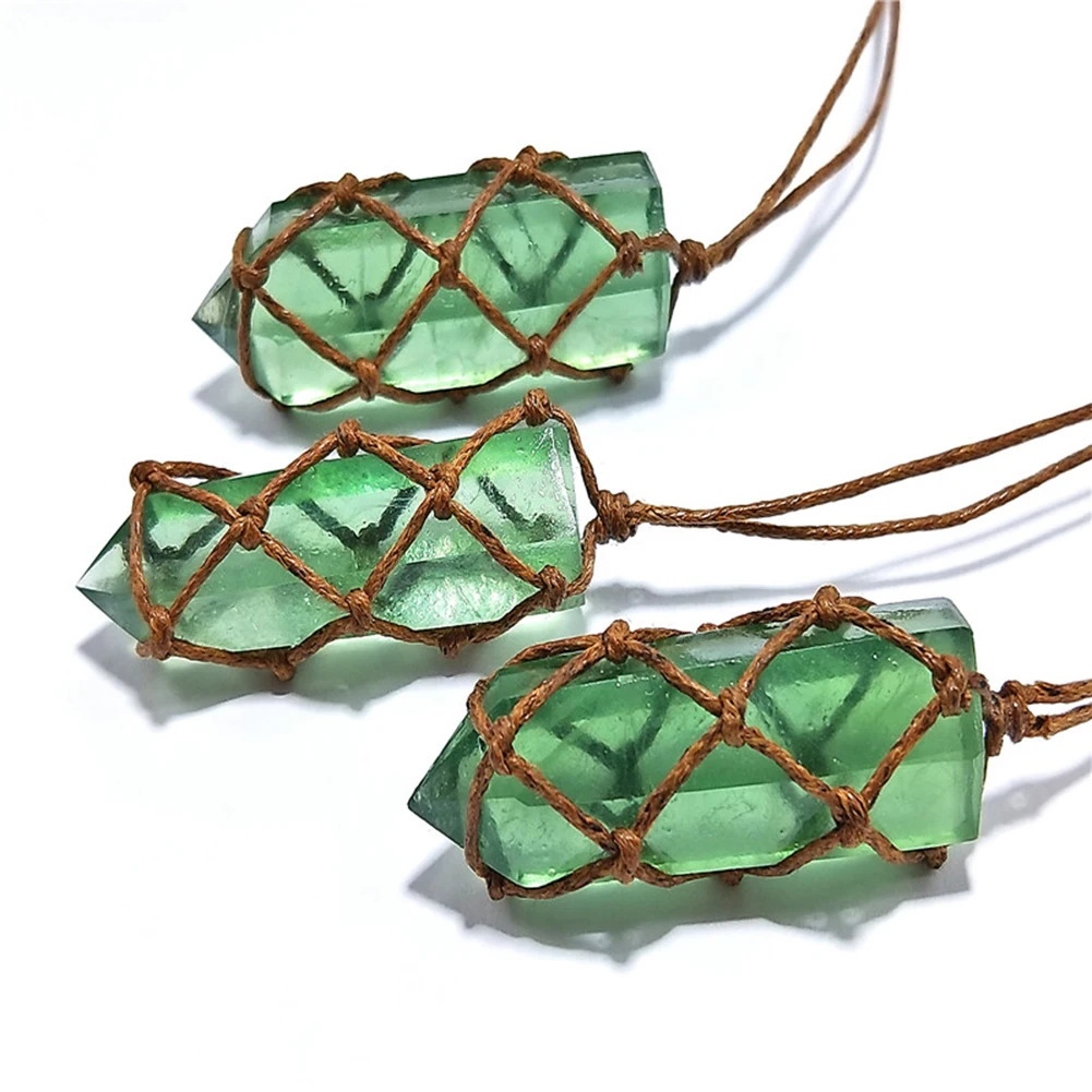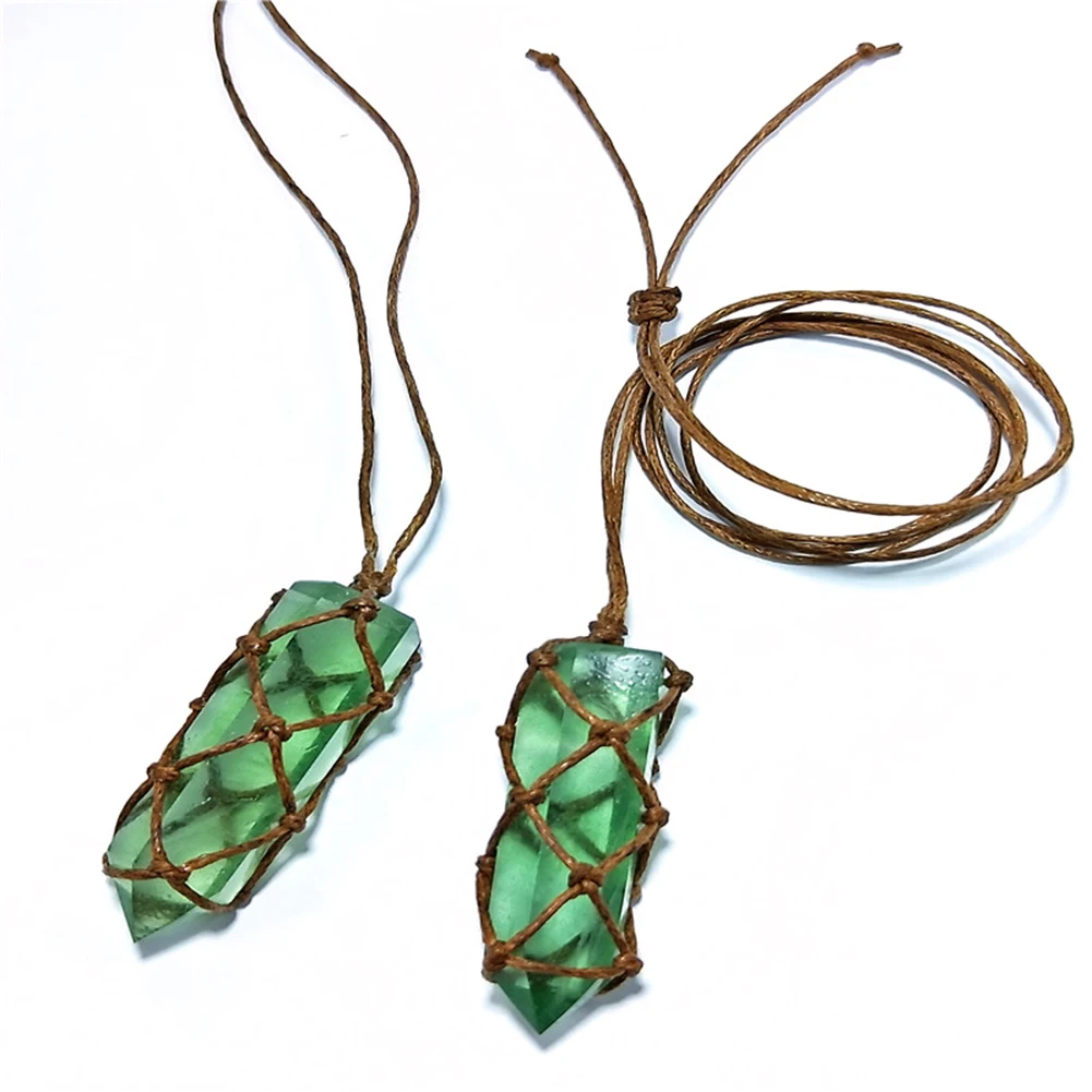 Natural Emerald Crystal Pendant Healing DT Gemstone Wand Reiki Green Fluorite Wrap Braid Necklace Yoga Macrame For Men Women