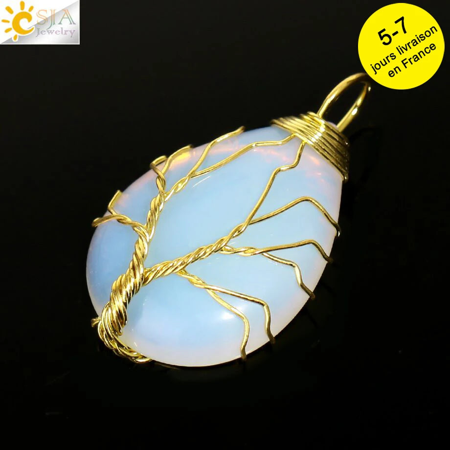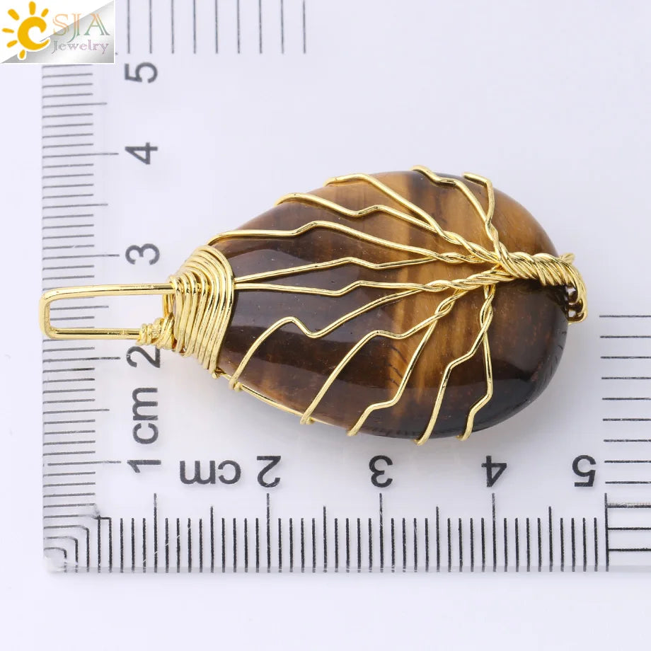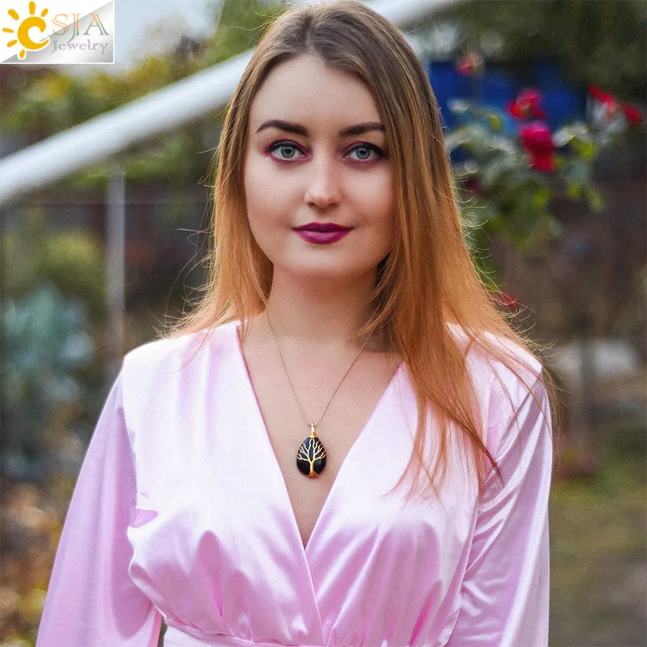 CSJA Tree of Life Necklace Natural Stone Pendant Gold Color Wire Wrap Gem Pink Quartz Tiger Eye Green Aventurine Suspension E585 | |