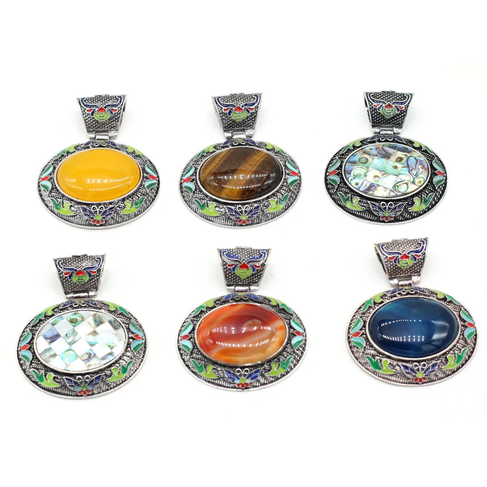Vintage Ethnic Natural Stone Crystal Agates Charms Elliptical Boho Abalone Shell Pendant for Jewelry Making DIY Necklace Gift